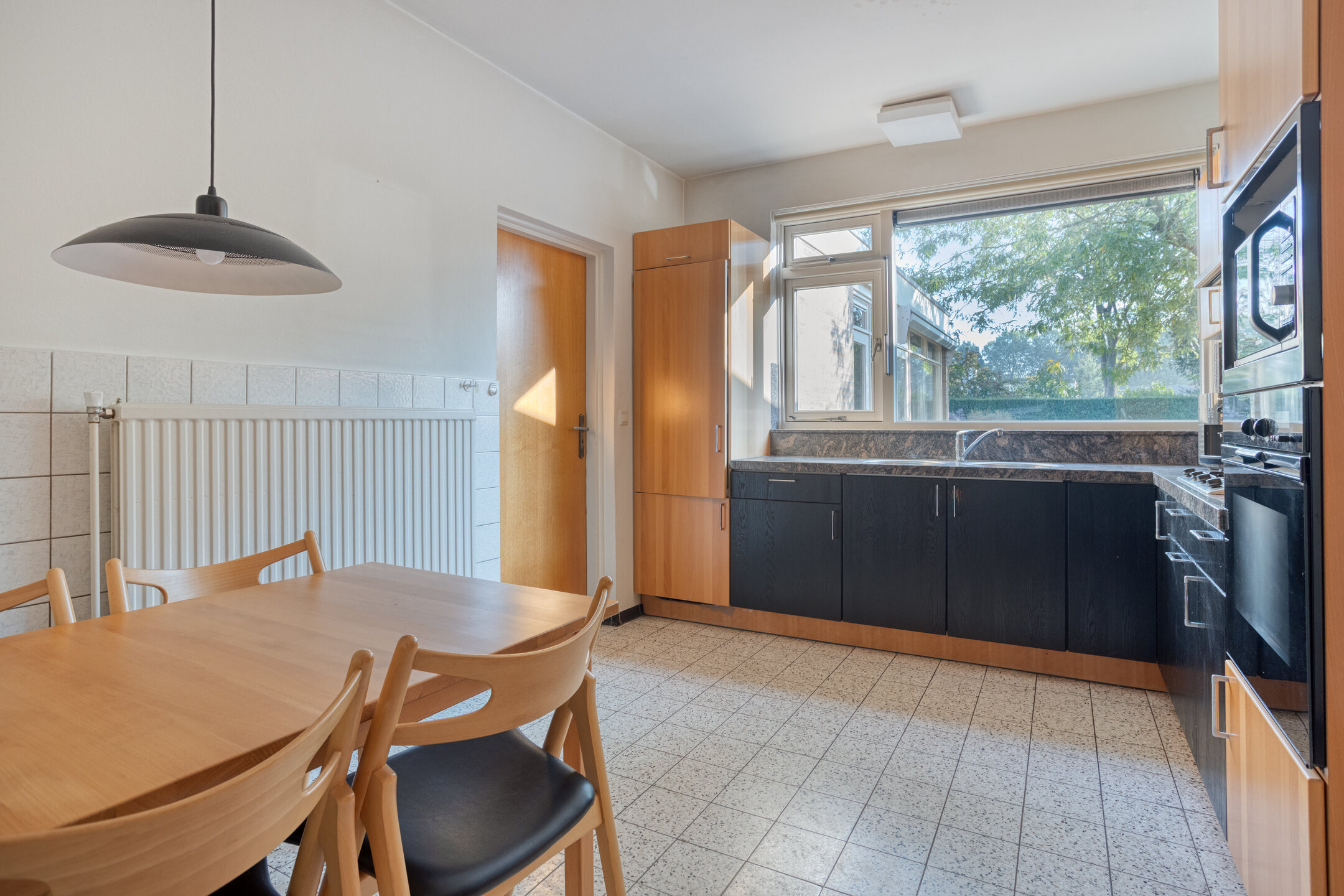 De woonkamer loopt door in de eethoek en woonkeuken, die samen een fijne leefruimte vormen. Hier kun je met gemak een grote eettafel kwijt — perfect voor gezellige etentjes of lange avonden met familie en vrienden. De keuken (circa 25/30 jaar oud) is functioneel ingericht en voorzien van een gaskookplaat, afzuigkap, oven en koelkast (deur defect).