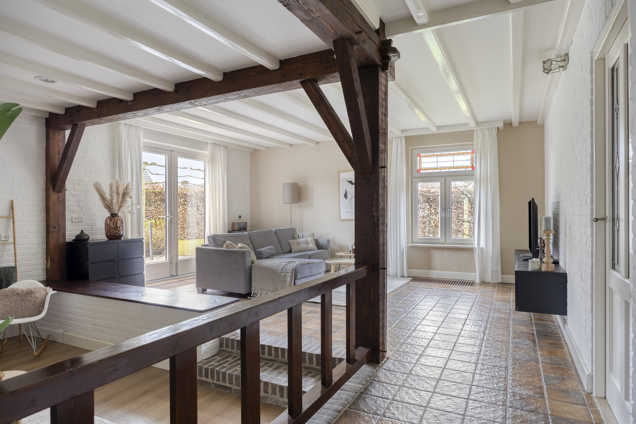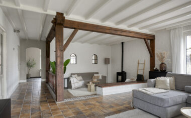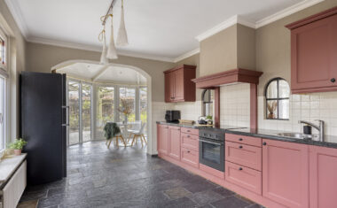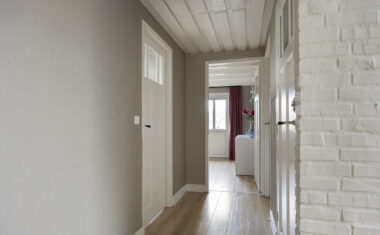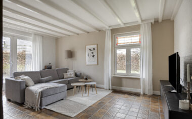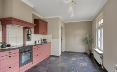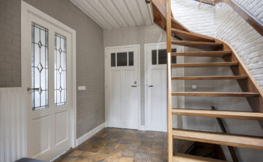 Begane grond: Entree/hal met trapopgang, garderobe, meterkast, toilet (2025 vernieuwd) en toegang tot de provisiekelder – woonkeuken met aangebouwde serre, beiden met leistenen vloer – woonkamer met knusse zitkuil – werkkamer/kantoor – bijkeuken – garage – carport.