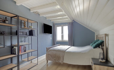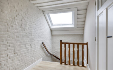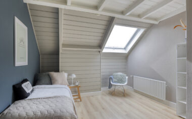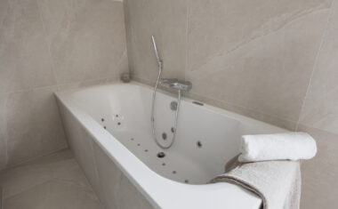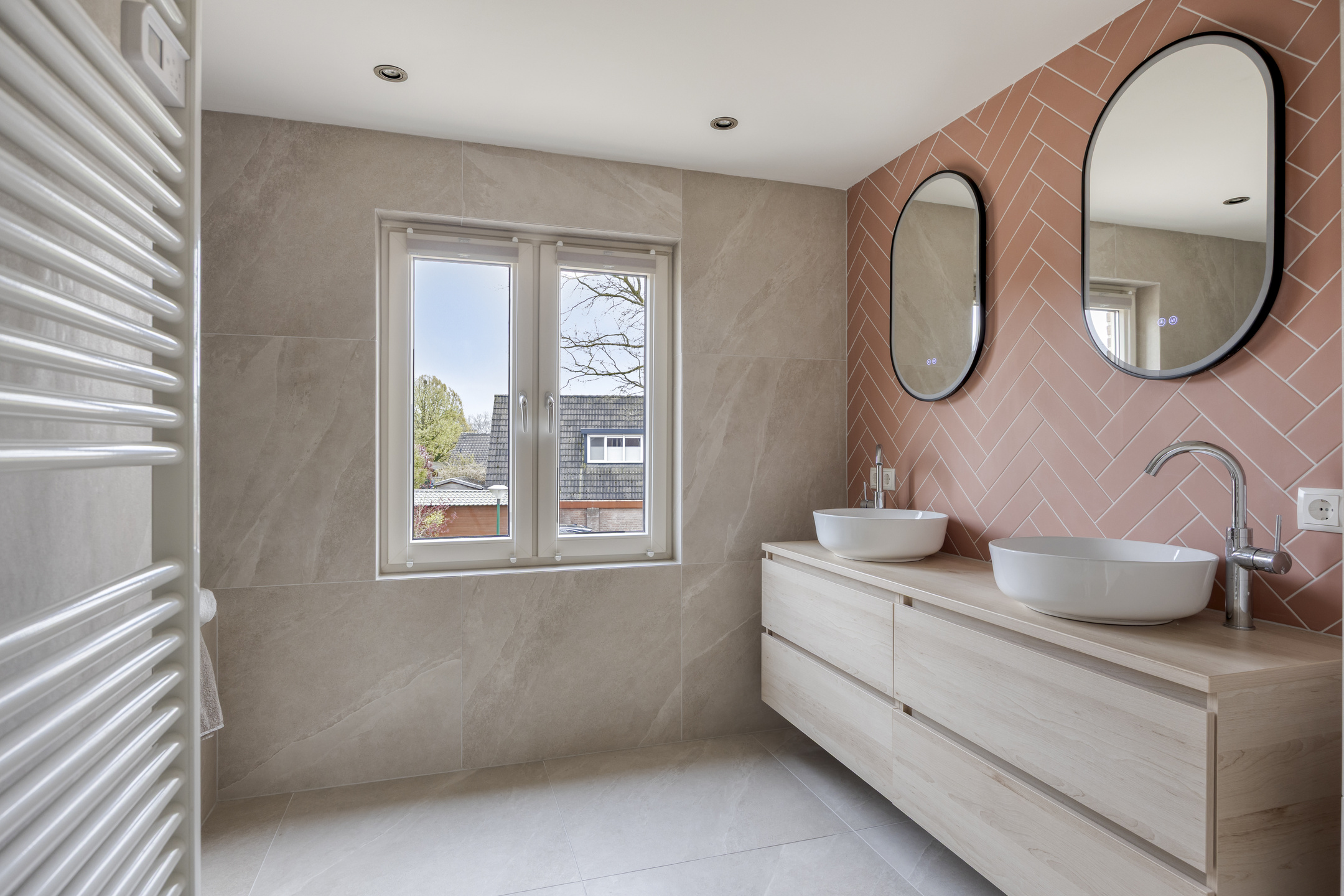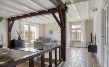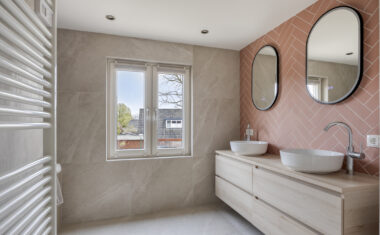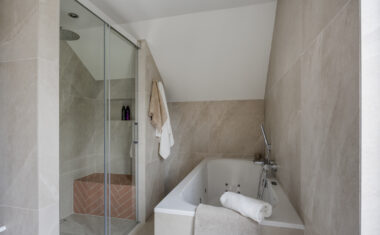 1e Verdieping: Overloop met separaat toilet (2025 vernieuwd) – 4 ruime slaapkamers – luxe badkamer, in 2025 vernieuwd met ligbad/whirlpool, inloopdouche, designradiator (elektrisch) en dubbele wastafel.