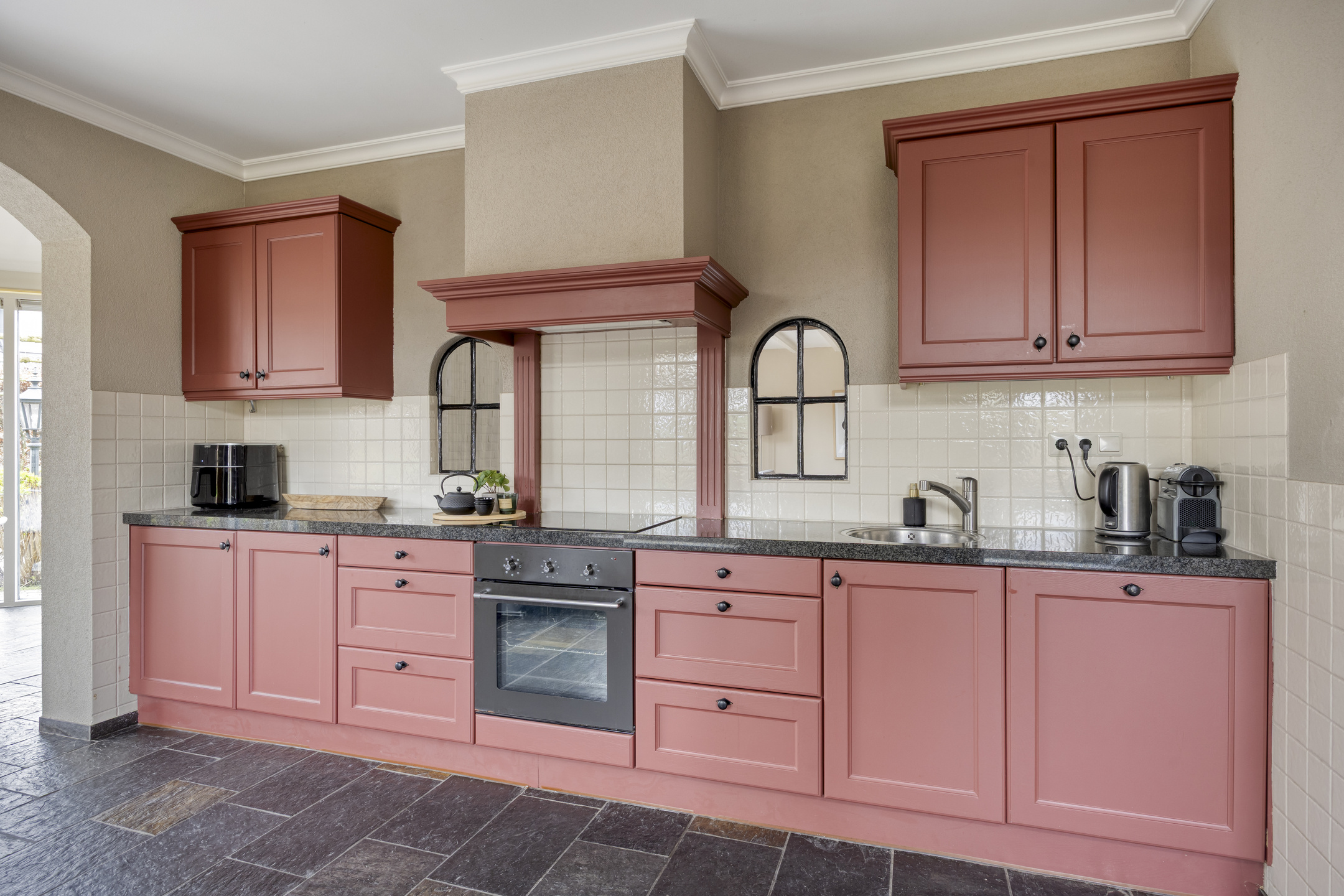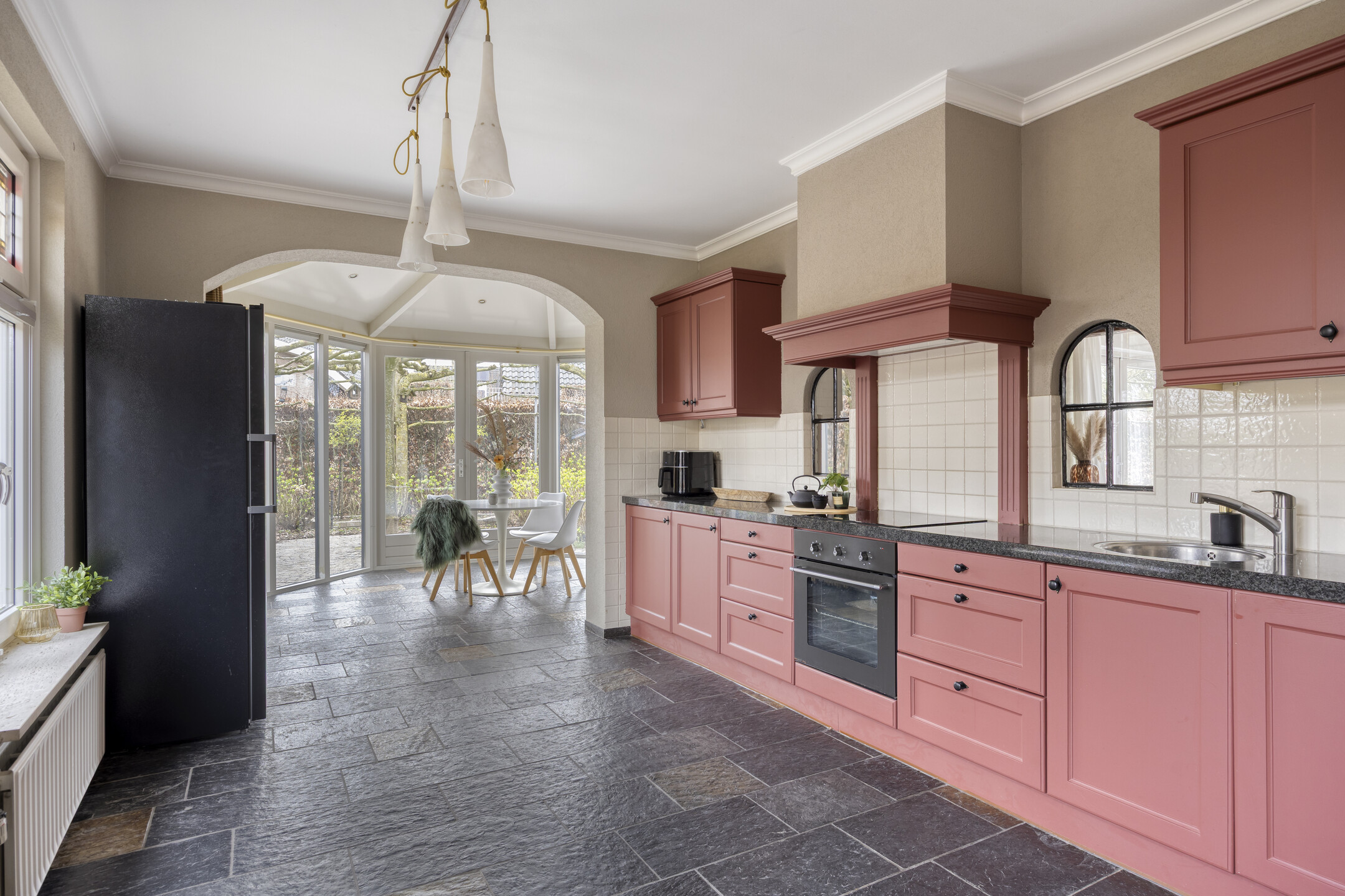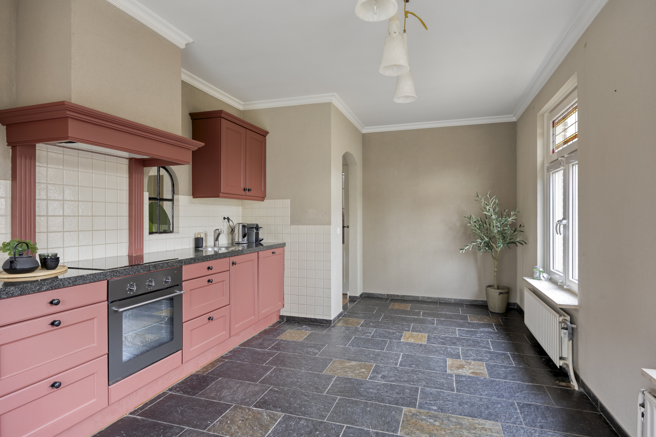 – keukenopstelling (2000) met inbouwapparatuur van 2020: inductiekookplaat, afzuigkap, oven, koelkast en vaatwasser.