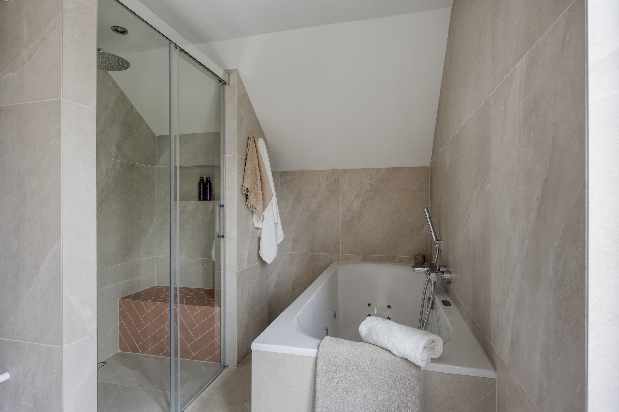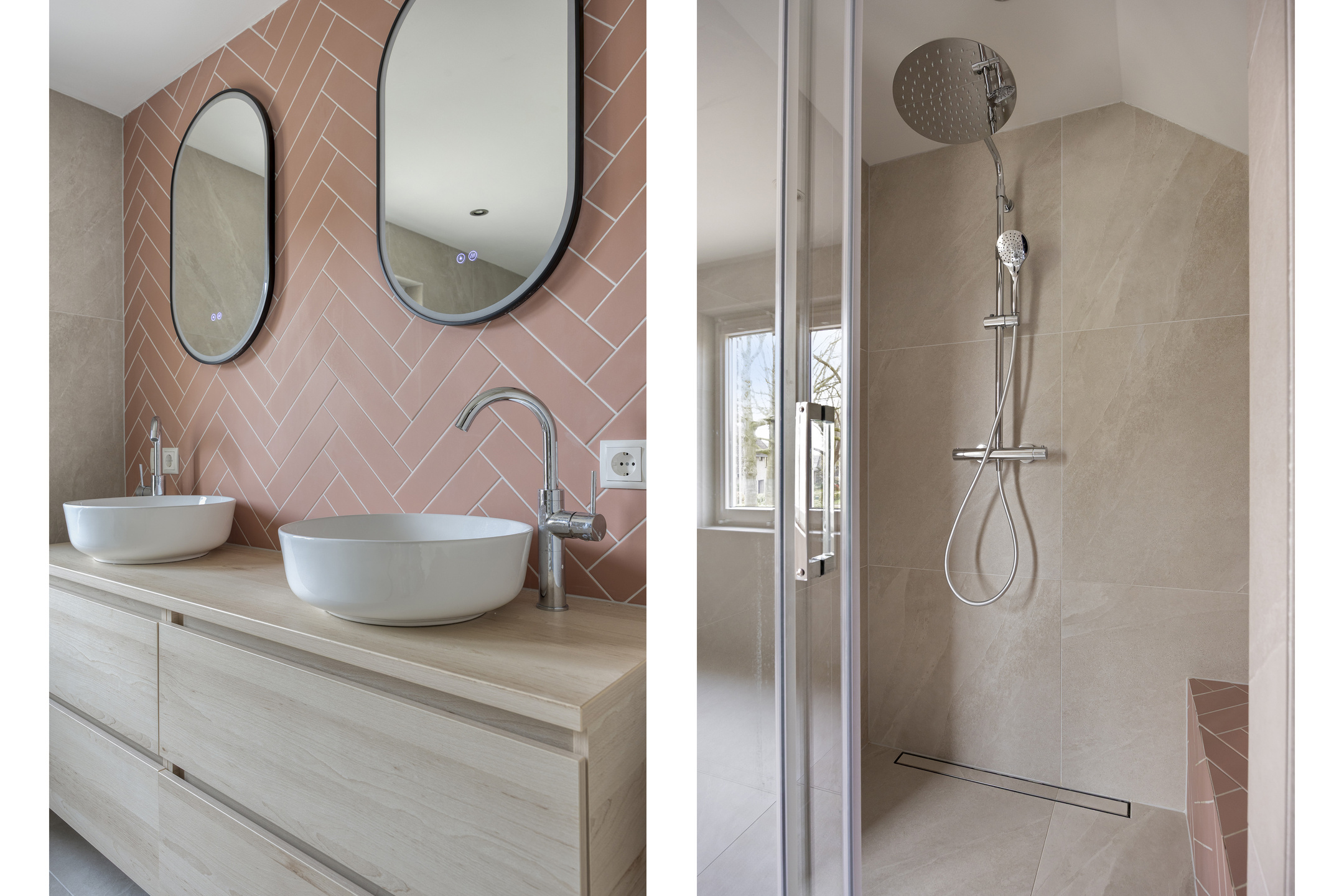 - Badkamer voorzieningen Ligbad, dubbele wastafel, inloopdouche